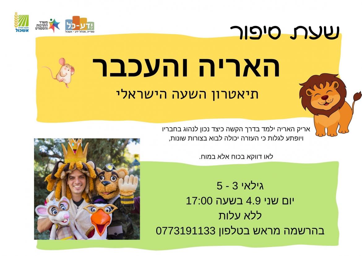 הוסף ללוח שנה 2023-09-04 00:00:00 2023-09-04 01:00:00 Asia/Jerusalem שעת סיפור - האריה והעכבר למידע מלא: https://eshkol.info/events/1121/ ספריית ידע כל