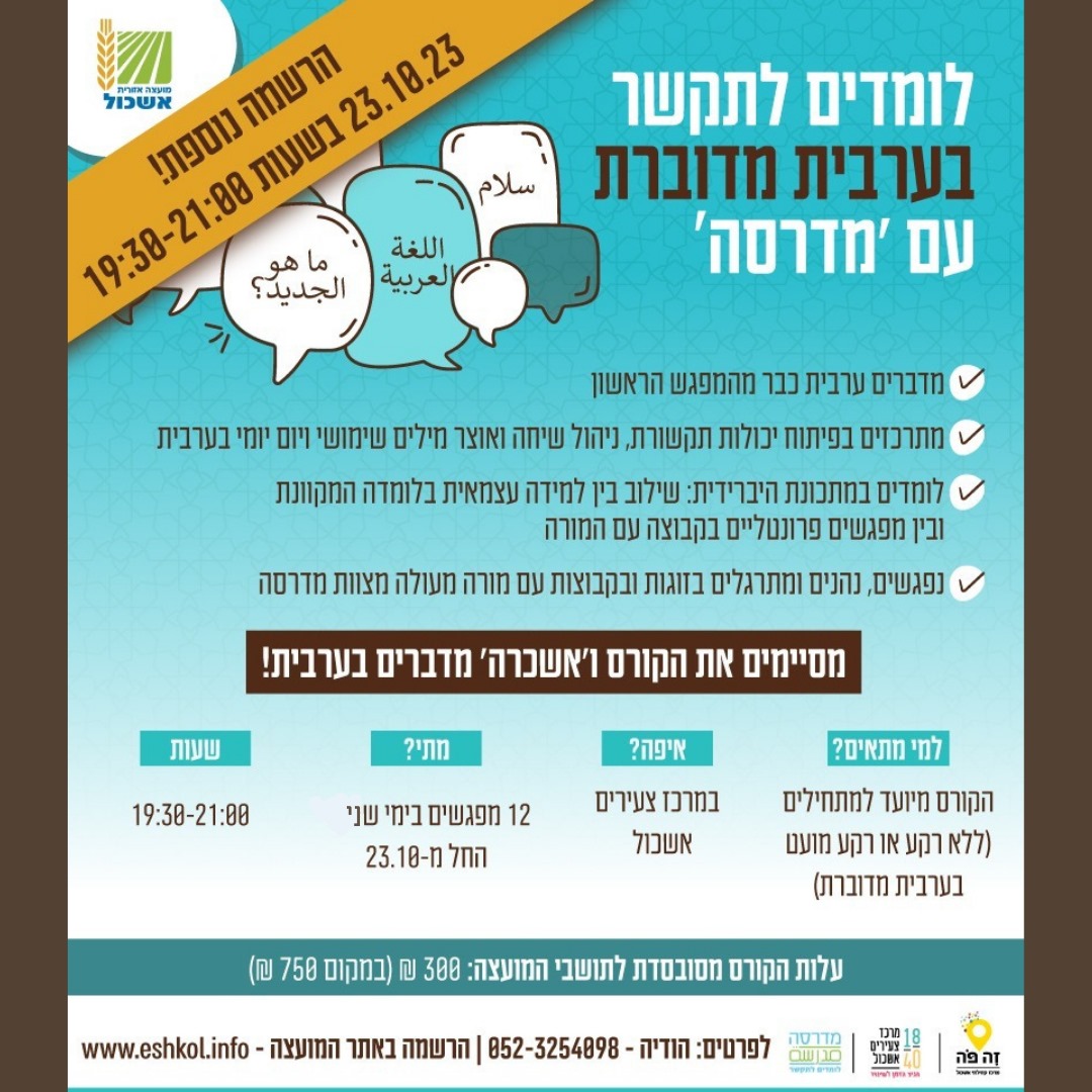 הוסף ללוח שנה 2023-10-23 00:00:00 2023-10-23 01:00:00 Asia/Jerusalem לומדים לתקשר בערבית מדוברת עם 'מדרסה' למידע מלא: https://eshkol.info/events/1133/ מרכז צעירים