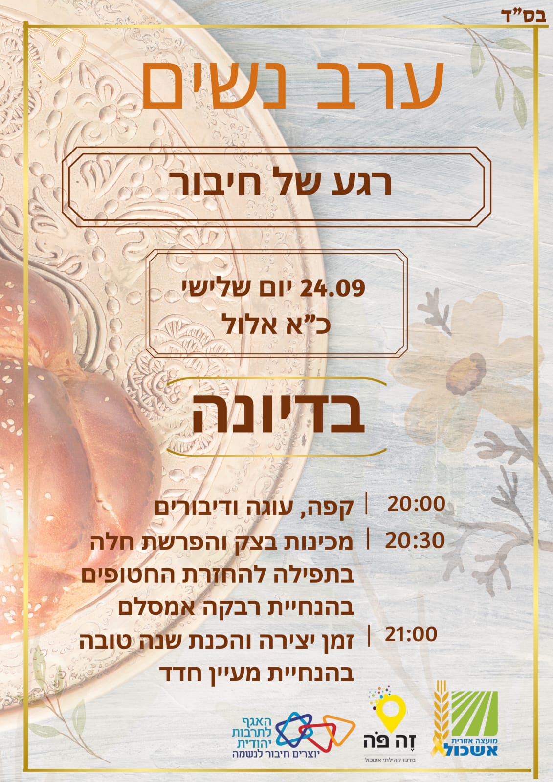 הוסף ללוח שנה 2024-09-24 00:00:00 2024-09-24 01:00:00 Asia/Jerusalem ערב נשים - רגע של חיבור למידע מלא: https://eshkol.info/events/1158/ בדיונה