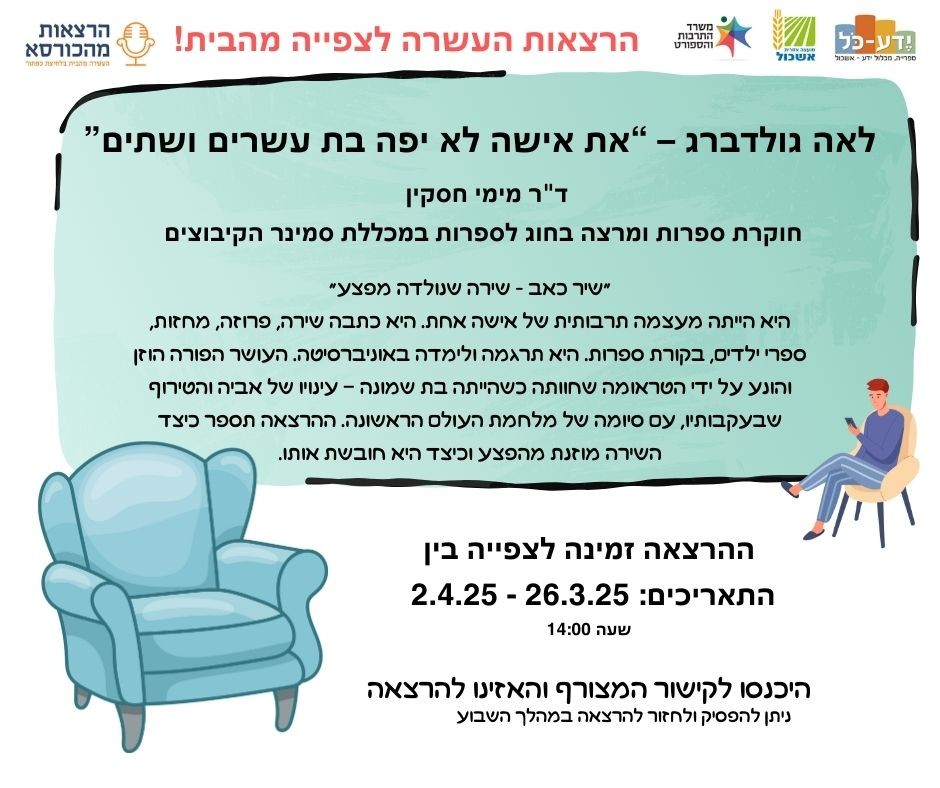הוסף ללוח שנה 2025-03-26 00:00:00 2025-04-02 00:00:00 Asia/Jerusalem לאה גולדברג - את אישה לא יפה בת עשרים ושתיים למידע מלא: https://eshkol.info/events/1232/