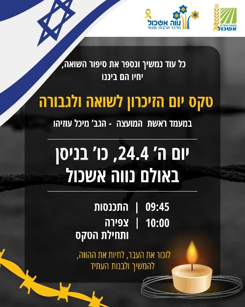אנו מזמינים אתכם לטקס יום הזיכרון לשואה ולגבורה שיתקיים ביום חמישי, 24.4, בשעה 10:00, באולם נווה אשכול.