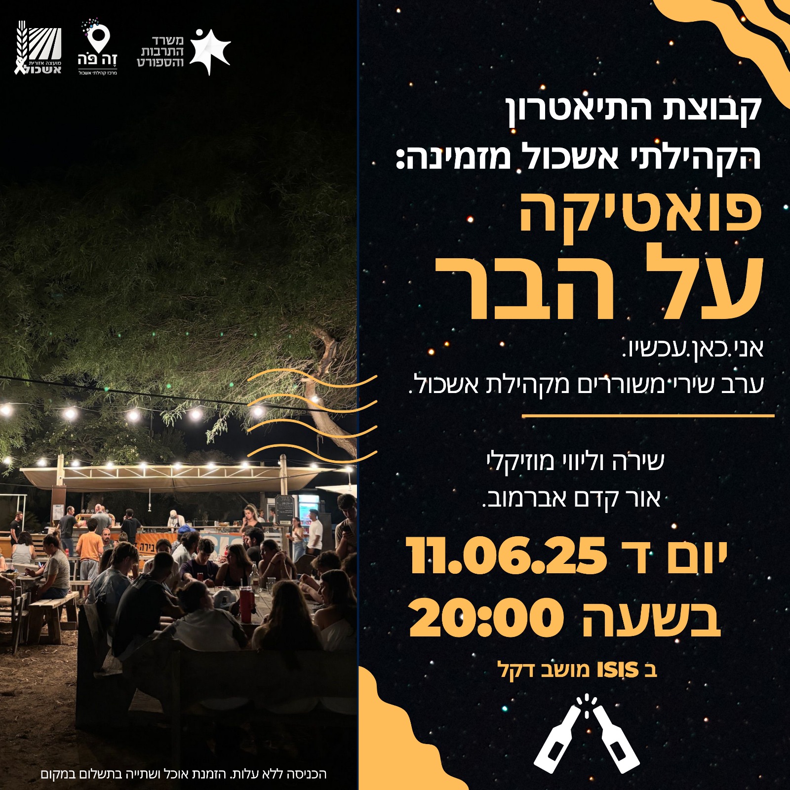 הוסף ללוח שנה 2025-06-11 00:00:00 2025-06-11 01:00:00 Asia/Jerusalem פואטיקה על הבר למידע מלא: https://eshkol.info/events/1281/ אייסיס - מושב דקל