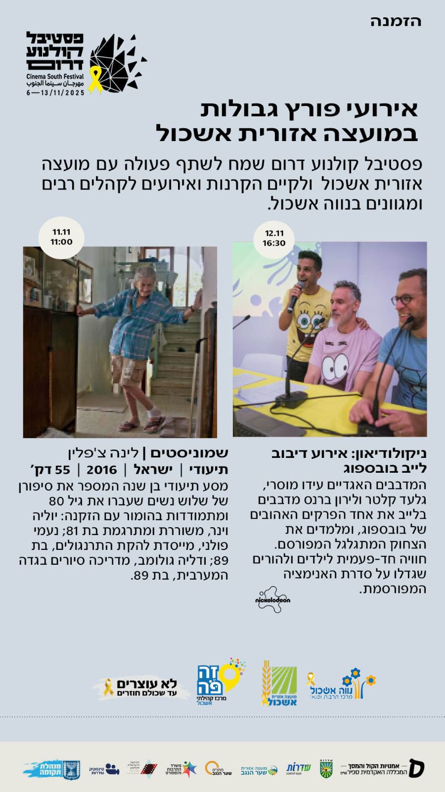 הוסף ללוח שנה 2025-11-11 00:00:00 2025-11-12 00:00:00 Asia/Jerusalem פסטיבל קולנוע דרום באשכול למידע מלא: https://eshkol.info/events/1364/ נווה אשכול