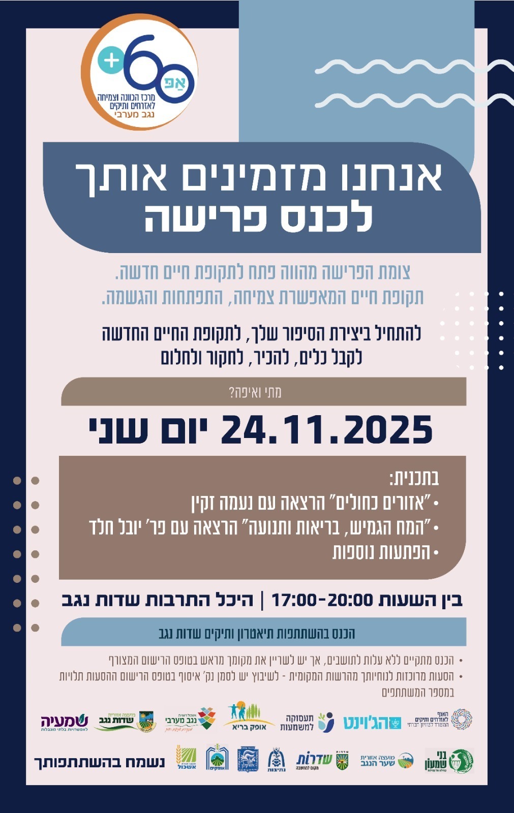 שמחים להזמינך לכנס הפורשים השנתי של אפ 60+ לכלל תושבי רשויות הנגב המערבי