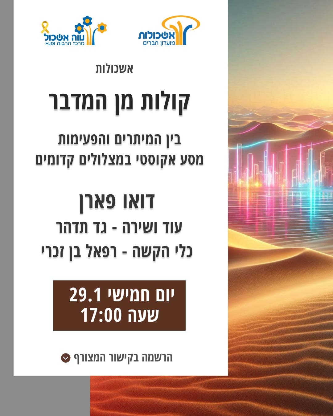 הוסף ללוח שנה 2026-01-29 00:00:00 2026-01-29 01:00:00 Asia/Jerusalem קולות מן המדבר למידע מלא: https://eshkol.info/events/1453/ נווה אשכול