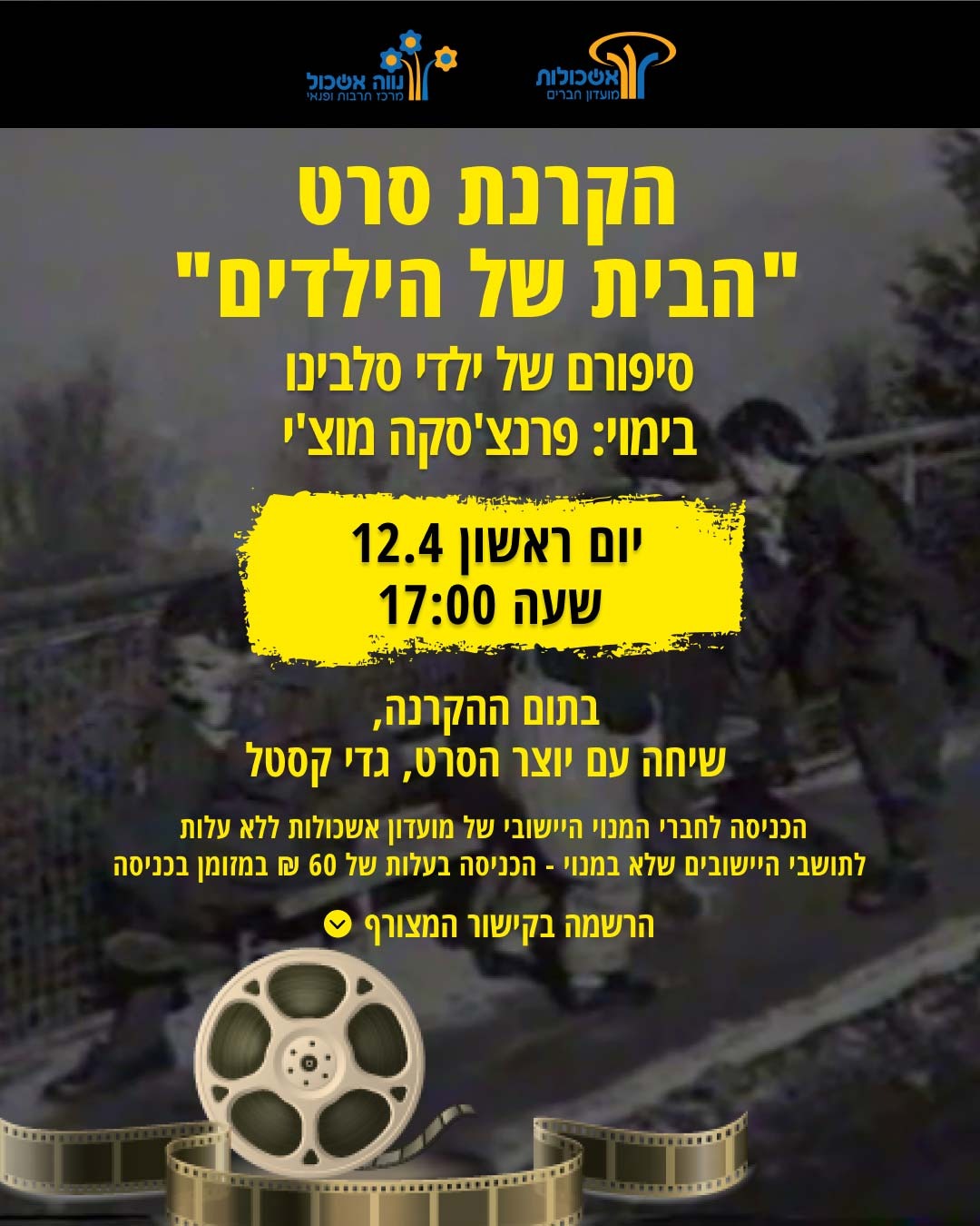הוסף ללוח שנה 2026-04-12 00:00:00 2026-04-12 01:00:00 Asia/Jerusalem הקרנת סרט - "הבית של הילדים" למידע מלא: https://eshkol.info/events/1510/ נווה אשכול