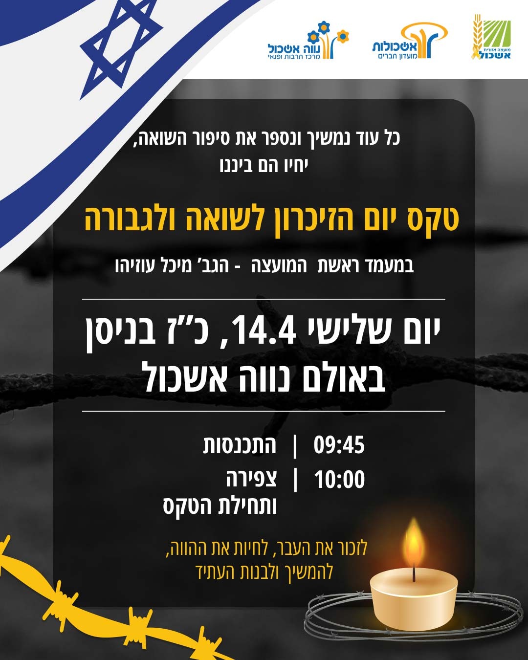 הוסף ללוח שנה 2026-04-14 00:00:00 2026-04-14 01:00:00 Asia/Jerusalem טקס יום הזיכרון לשואה ולגבורה למידע מלא: https://eshkol.info/events/1511/ אולם נווה אשכול