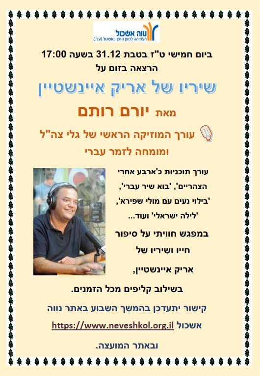 הוסף ללוח שנה 2020-12-31 00:00:00 2020-12-31 01:00:00 Asia/Jerusalem שיריו של אריק איינשטיין - יורם רותם למידע מלא: https://eshkol.info/events/179/ ZOOM