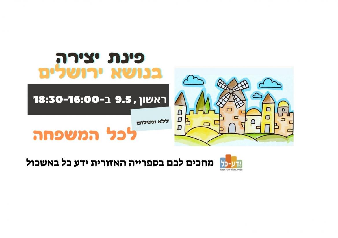 הוסף ללוח שנה 2021-05-09 00:00:00 2021-05-09 00:00:00 Asia/Jerusalem פינת יצירה בנושא ירושלים למידע מלא: https://eshkol.info/events/321/ ספריית ידע כל