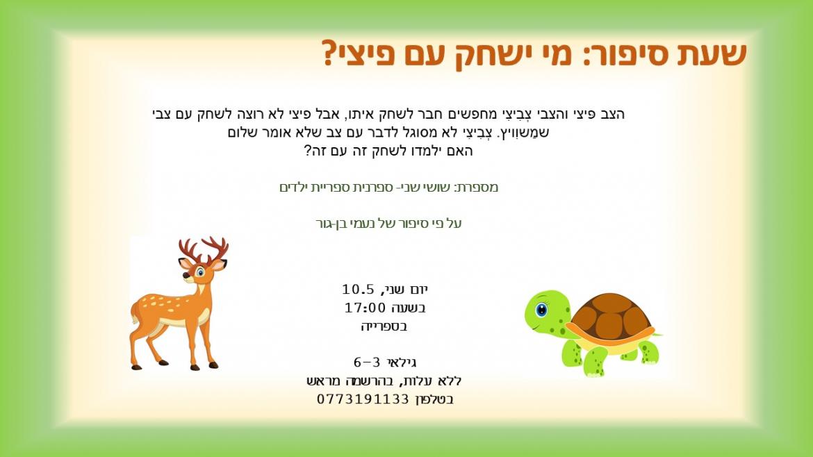 הוסף ללוח שנה 2021-05-10 00:00:00 2021-05-10 01:00:00 Asia/Jerusalem שעת סיפור - מי ישחק עם פיצי ? למידע מלא: https://eshkol.info/events/322/ ספריית ידע כל