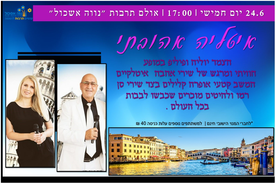 הוסף ללוח שנה 2021-06-24 00:00:00 2021-06-24 01:00:00 Asia/Jerusalem איטליה אהובתי - מופע למידע מלא: https://eshkol.info/events/377/ אולם תרבות נווה אשכול
