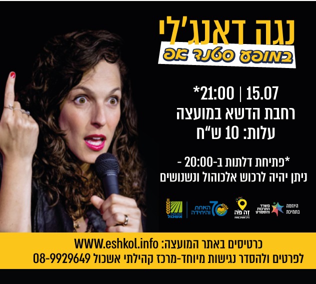 הוסף ללוח שנה 2021-07-15 00:00:00 2021-07-15 01:00:00 Asia/Jerusalem נגה דאנג'לי במופע סטנד אפ למידע מלא: https://eshkol.info/events/413/ ברחבת הדשא במועצה