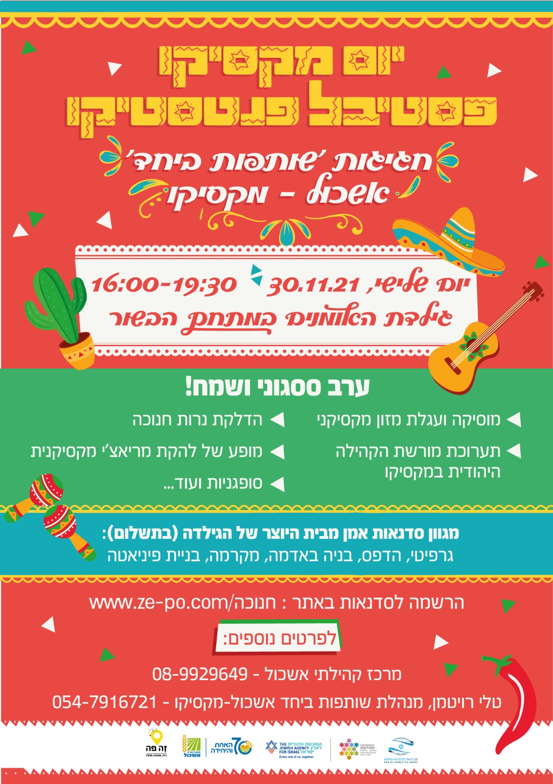 ערב ססגוני ושמח, מוסיקה, עגלת מזון מקסיקני, תערוכת מורשת הקהילה היהודית במקסיקו, מגוון סדנאות אמן מבית היוצר של הגילדה :גרפיטי, הדפס, בניה באדמה, מקרמה, בניית פיניאטה(בתשלום),