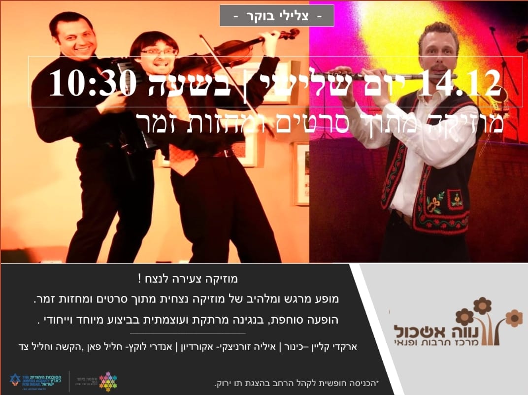 הוסף ללוח שנה 2021-12-14 00:00:00 2021-12-14 01:00:00 Asia/Jerusalem צלילי בוקר - מוזיקה מתוך סרטים ומחזות זמר למידע מלא: https://eshkol.info/events/532/ נווה אשכול