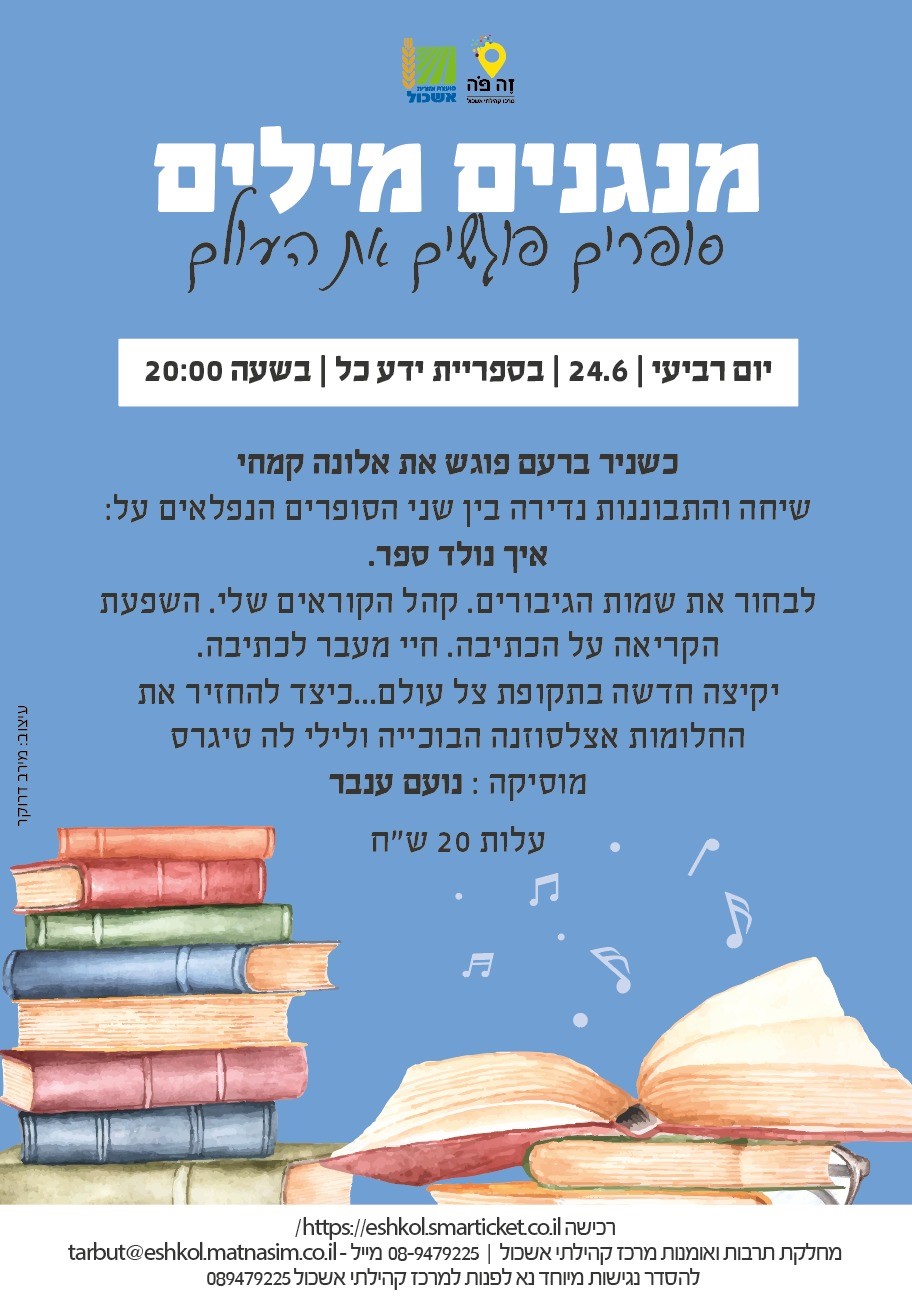 הוסף ללוח שנה 2020-06-24 00:00:00 2020-06-24 01:00:00 Asia/Jerusalem מנגנים מילים- סופרים פוגשים עולם למידע מלא: https://eshkol.info/events/54/ ספריית ידע כל