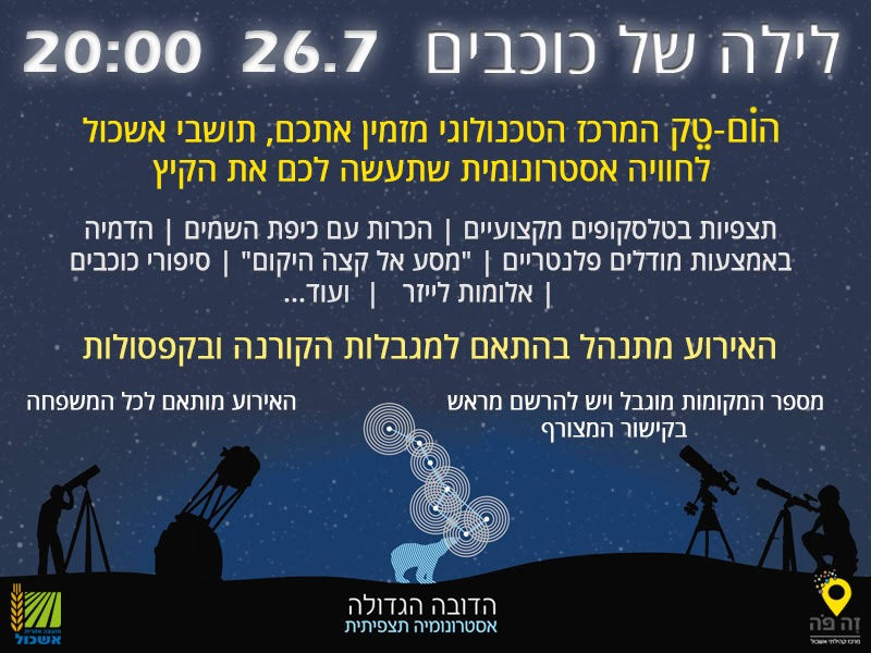 הוסף ללוח שנה 2020-07-26 00:00:00 2020-07-26 01:00:00 Asia/Jerusalem לילה של כוכבים למידע מלא: https://eshkol.info/events/57/ מרכז חלו"ם- נופי הבשור