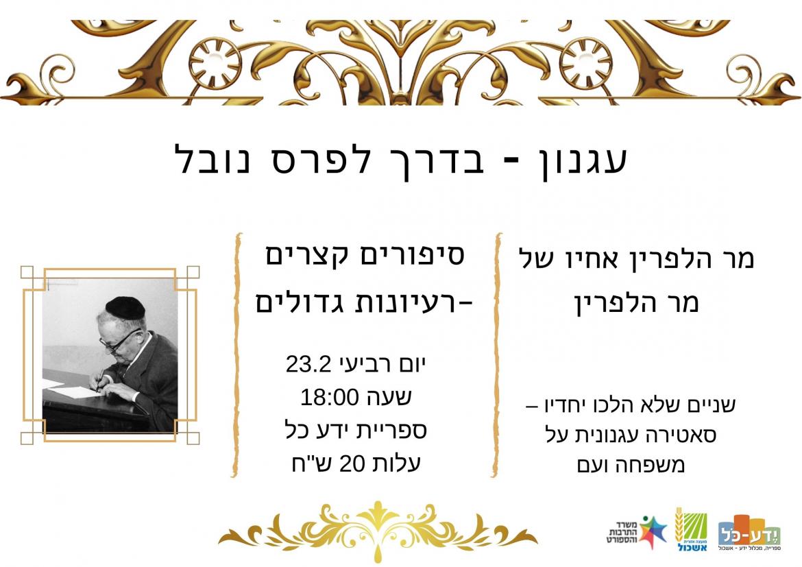 הוסף ללוח שנה 2022-02-23 00:00:00 2022-02-23 01:00:00 Asia/Jerusalem עגנון - בדרך לפרס נובל למידע מלא: https://eshkol.info/events/597/ ספריית ידע כל