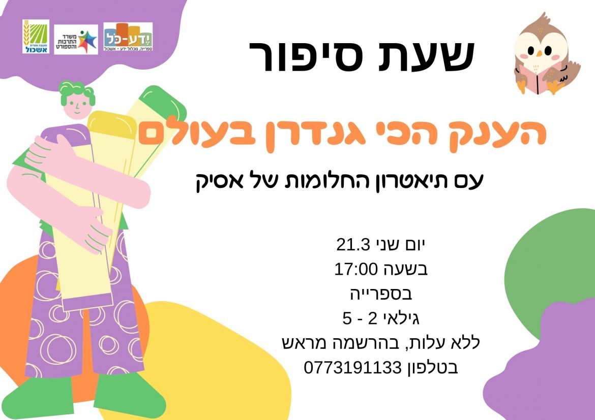 הוסף ללוח שנה 2022-03-21 00:00:00 2022-03-21 01:00:00 Asia/Jerusalem שעת סיפור : הענק הכי גנדרן בעולם למידע מלא: https://eshkol.info/events/620/ ספריית ידע כל