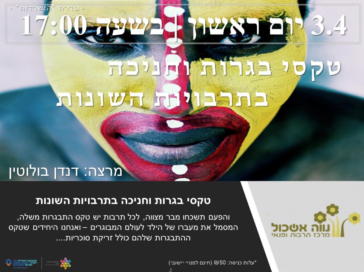 הוסף ללוח שנה 2022-04-03 00:00:00 2022-04-03 01:00:00 Asia/Jerusalem טקסי בגרות וחניכה בתרבויות השונות למידע מלא: https://eshkol.info/events/653/ נווה אשכול
