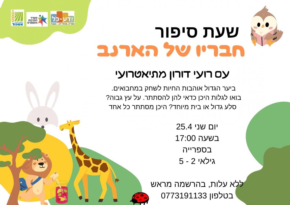 הוסף ללוח שנה 2022-04-25 00:00:00 2022-04-25 01:00:00 Asia/Jerusalem שעת סיפור : חבריו של הארנב למידע מלא: https://eshkol.info/events/657/ ספריית ידע כל