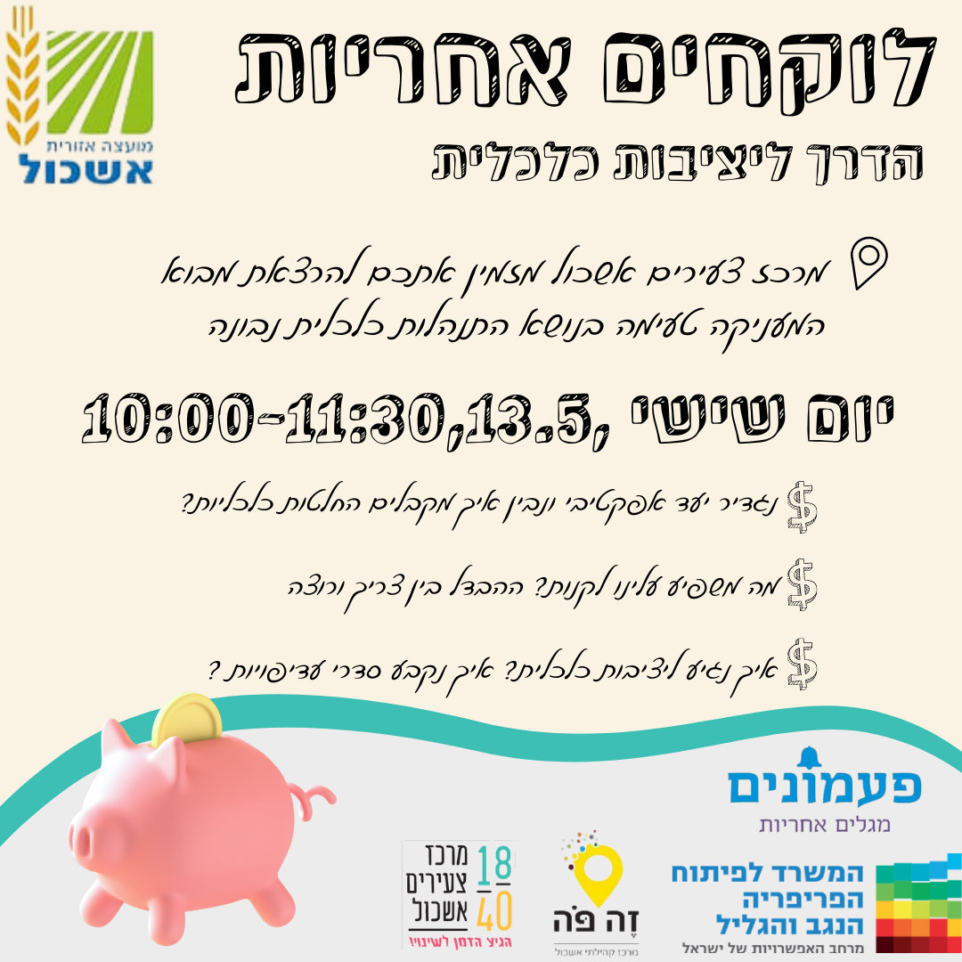 מרכז צעירים אשכול והאגף האסטרטגי מזמינים אתכם להרצאת מבוא המעניקה טעימה בנושא התנהלות כלכלית נבונה