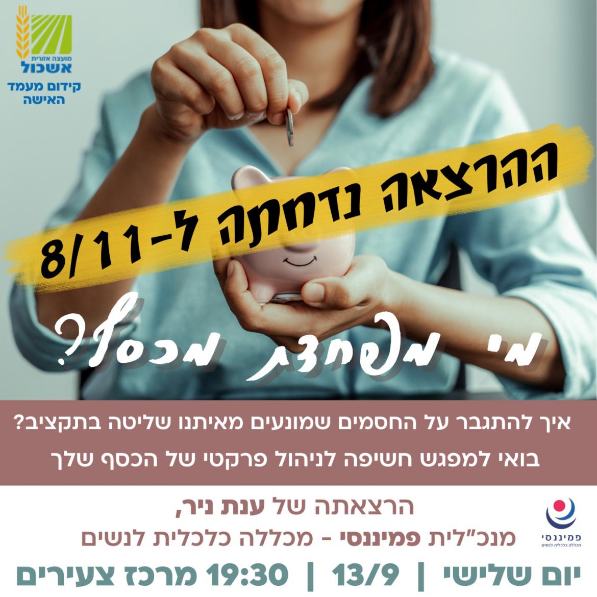 הוסף ללוח שנה 2022-11-08 00:00:00 2022-11-08 01:00:00 Asia/Jerusalem מי מפחדת מכסף ? למידע מלא: https://eshkol.info/events/765/ מרכז צעירים אשכול