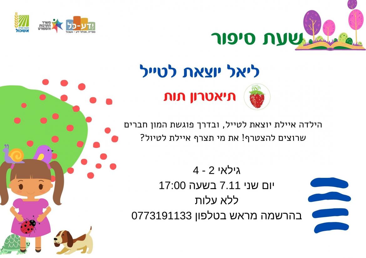 הוסף ללוח שנה 2022-11-07 00:00:00 2022-11-07 01:00:00 Asia/Jerusalem שעת סיפור ליאל יוצאת לטייל למידע מלא: https://eshkol.info/events/835/ ספריית ידע כל