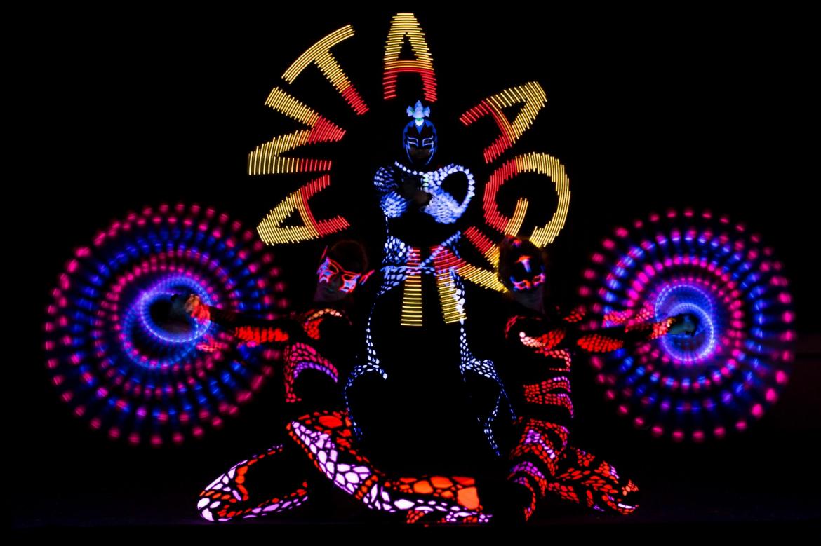 וטכנולוגיה חדשנית,אלמנטים אולטרה סגולים ואפקטים חזותיים מיוחדים עם מחול,קרקס ואקרובטיקה.