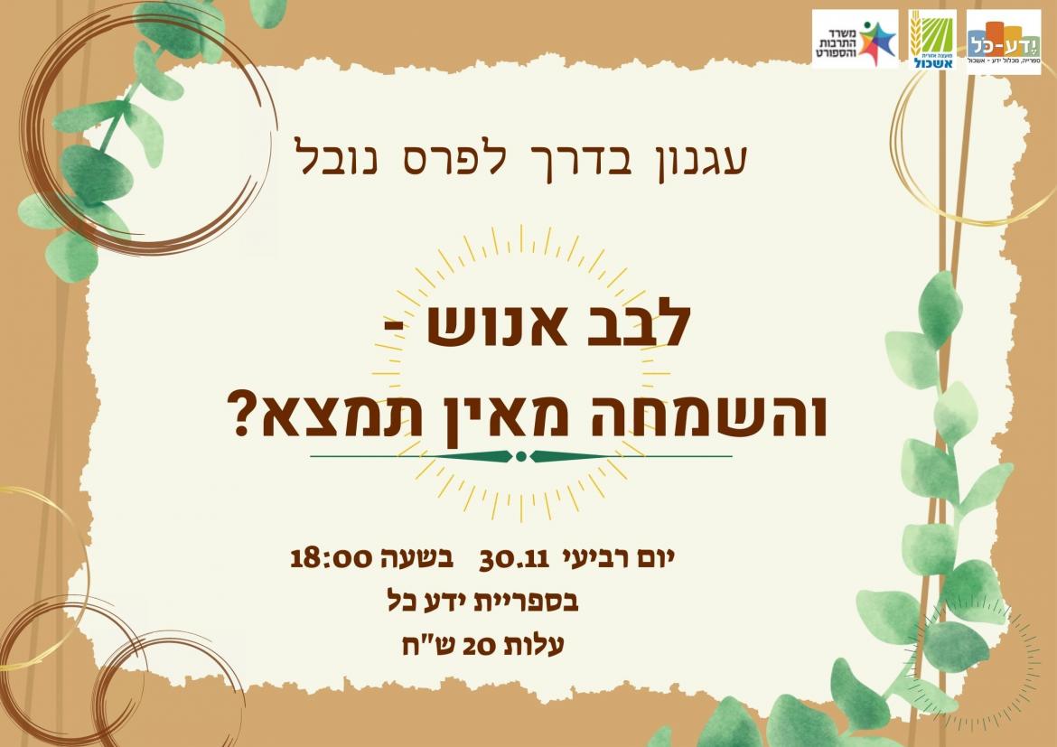 הוסף ללוח שנה 2022-11-30 00:00:00 2022-11-30 01:00:00 Asia/Jerusalem עגנון בדרך לפרס נובל - לבב אנוש למידע מלא: https://eshkol.info/events/862/ ספריית ידע כל