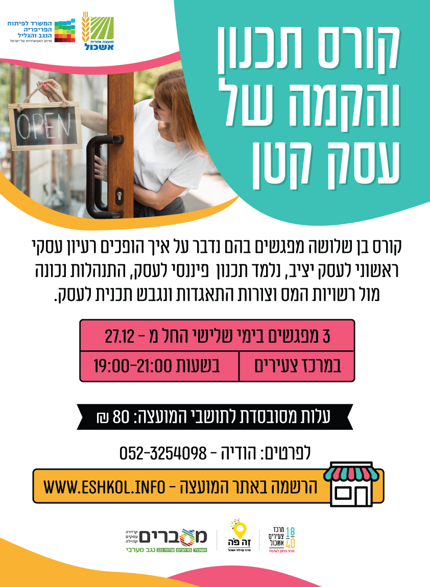 קורס בן שלושה מפגשים בהם נדבר על איך הופכים רעיון עסקי ראשוני לעסק יציב, נלמד תכנון פיננסי לעסק, התנהלות נכונה מול רשויות המס וצורות התאגדות ונגבש תכנית לעסק.
