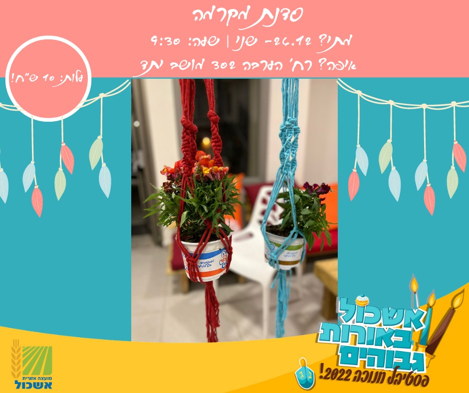 סדנת מקרמה - הכנת מתלה לעציץ מחוטי מקרמה. סדנה קלילה ויצירתית שמתאימה לנערות, לנשים, לסבתות ולכל מי שרוצה ללמוד טכניקה חדשה וסופר טרנדית. גילאים: 16 עד 120