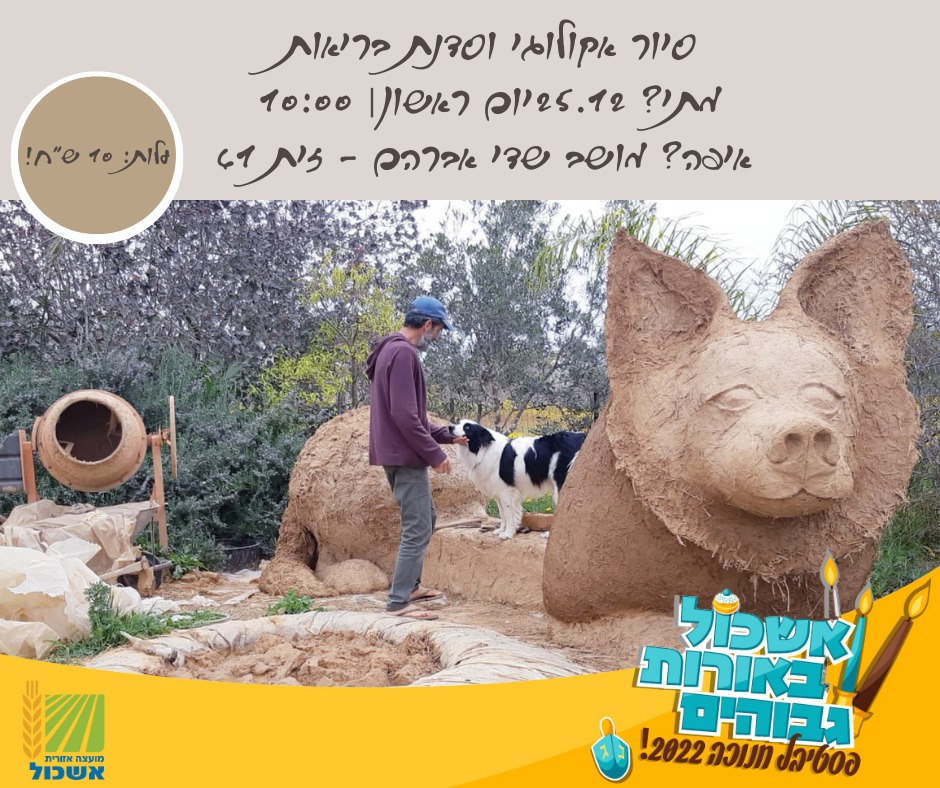 סיור : בבית אקולוגי ייחודי ויפה, חצר עם מגוון עצי פרי מיוחדים , פסלים ויצירות מאדמה מדהימים מעשה ידי.