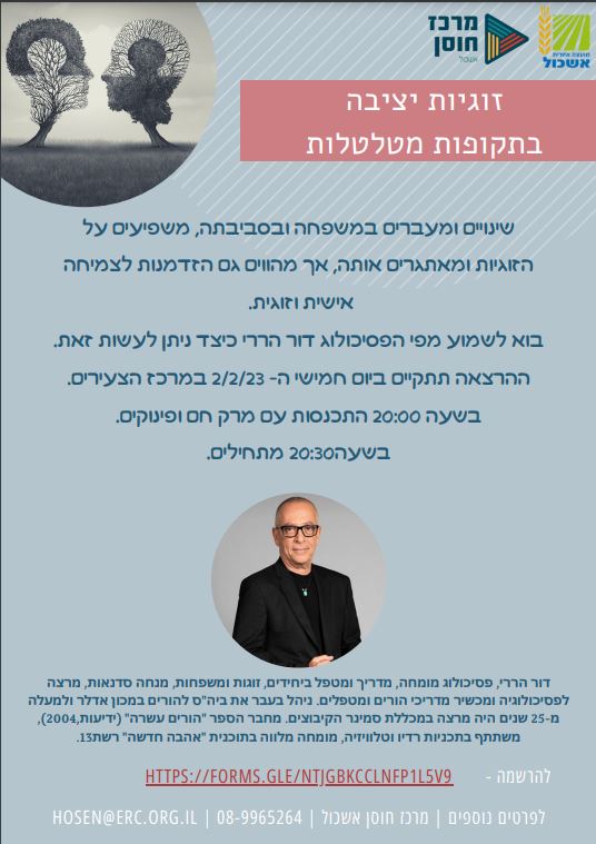 הוסף ללוח שנה 2023-02-02 00:00:00 2023-02-02 01:00:00 Asia/Jerusalem זוגיות יציבה בתקופות מטלטלות למידע מלא: https://eshkol.info/events/948/ מרכז צעירים אשכול