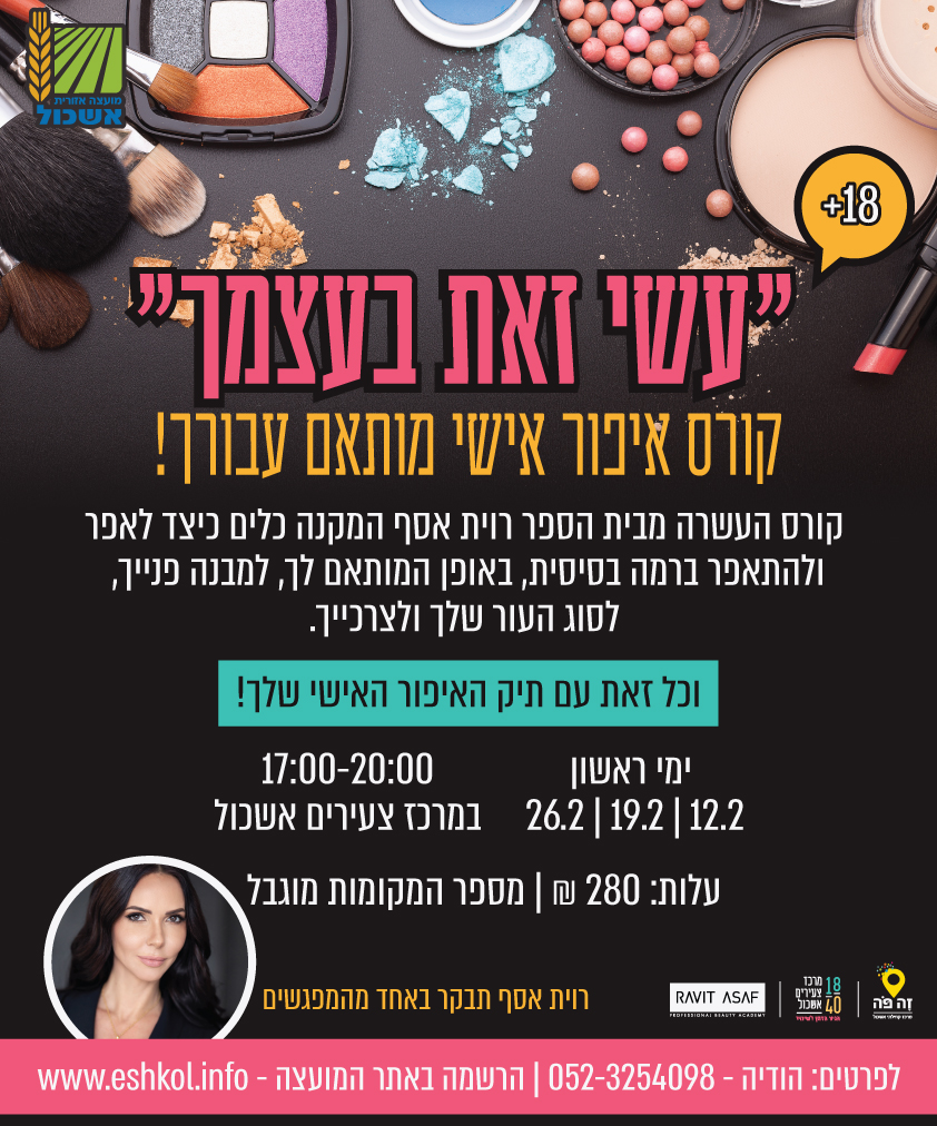 הוסף ללוח שנה 2023-02-12 00:00:00 2023-02-12 01:00:00 Asia/Jerusalem "עשי זאת בעצמך" - קורס איפור אישי מותאם עבורך למידע מלא: https://eshkol.info/events/959/ מרכז צעירים אשכול