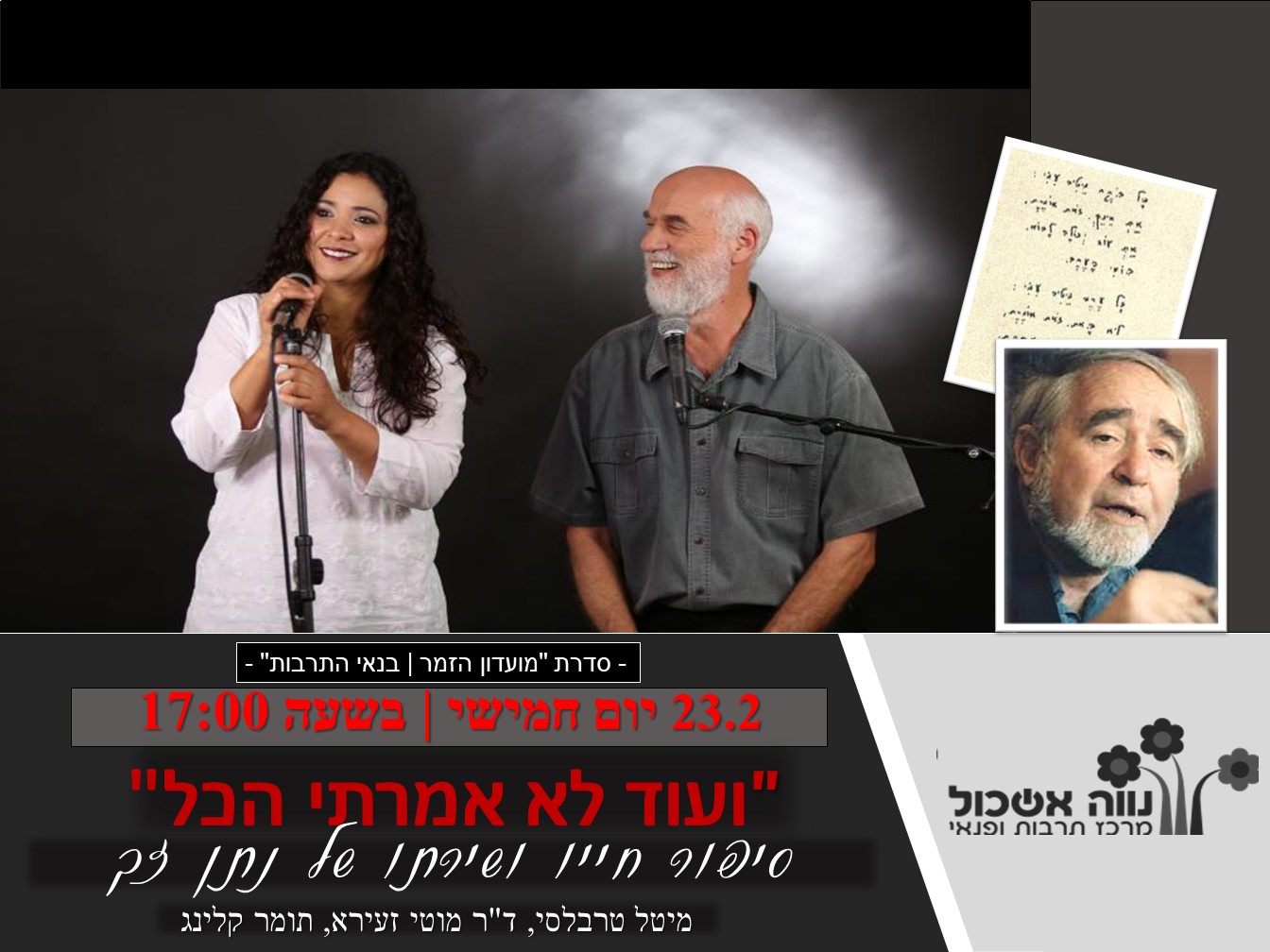 הוסף ללוח שנה 2023-02-23 00:00:00 2023-02-23 01:00:00 Asia/Jerusalem ועוד לא אמרתי הכל - סיפור חייו ושירתו של נתן זך / מיטל טרבלסי, דר מוטי זעירא, תומר קלינג למידע מלא: https://eshkol.info/events/974/ נווה אשכול