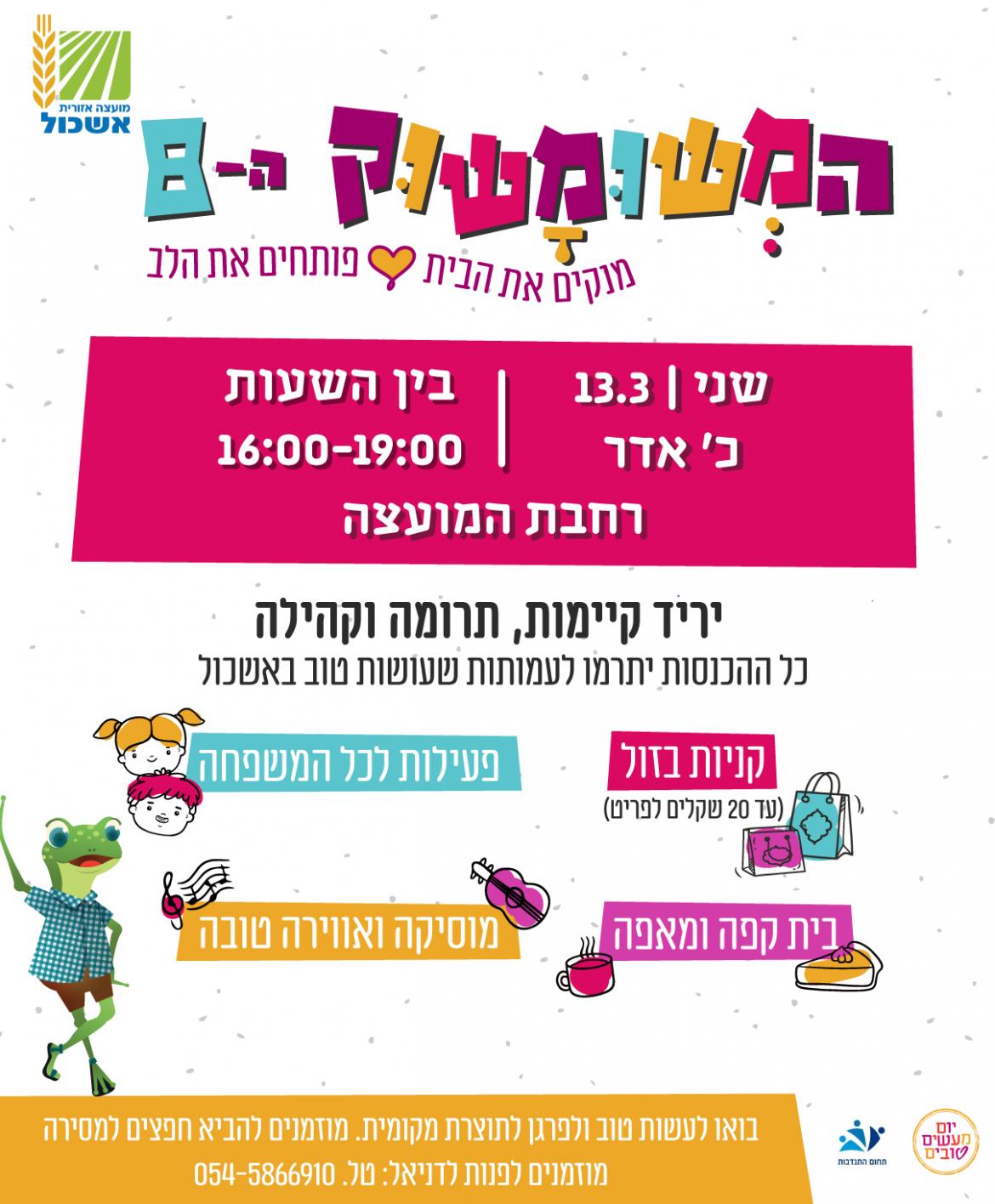 ביום שני תושבי אשכול נפגשים במשומשוק - אירוע שכולו קיימות, תרומה וקהילה. מחכים לכם עם שוק יד 2, יצירה, משחקים ושלל הפתעות!!