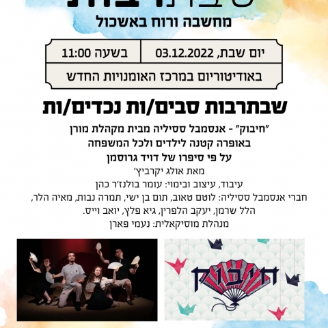 03 דצמברשבת תרבות סבתות וסבים נכדים ונכדות/ חיבוק - על פי ספרו של דוד גרוסמןאודיטוריום מרכז האומניות החדש -