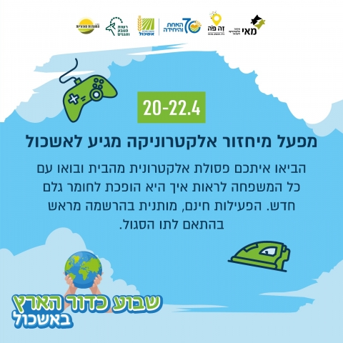 20 אפרילשבוע כדור הארץ באשכול- מפעל מיחזור אלקטרוניקהמגרש הספורט בית הספר שחר אשכול -