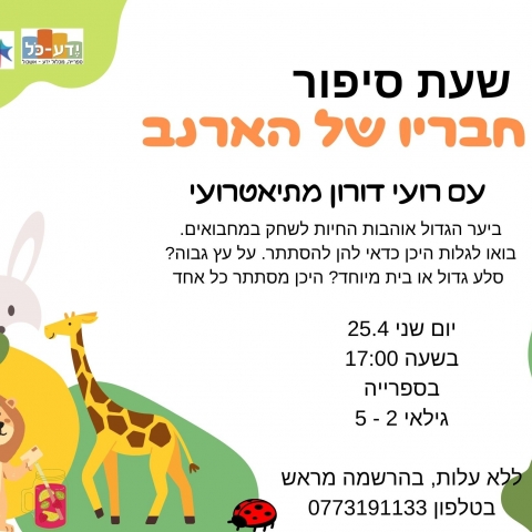 25 אפרילשעת סיפור : חבריו של הארנבספריית ידע כל -