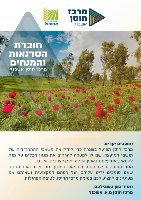 מרכז חוסן אשכול איגד עבורינו מגוון סדנאות המותאמות לצרכים שלנו בימים אלה, בהנחיית מנחים ומנחות מקצועיים שאושרו ע"י המרכז.