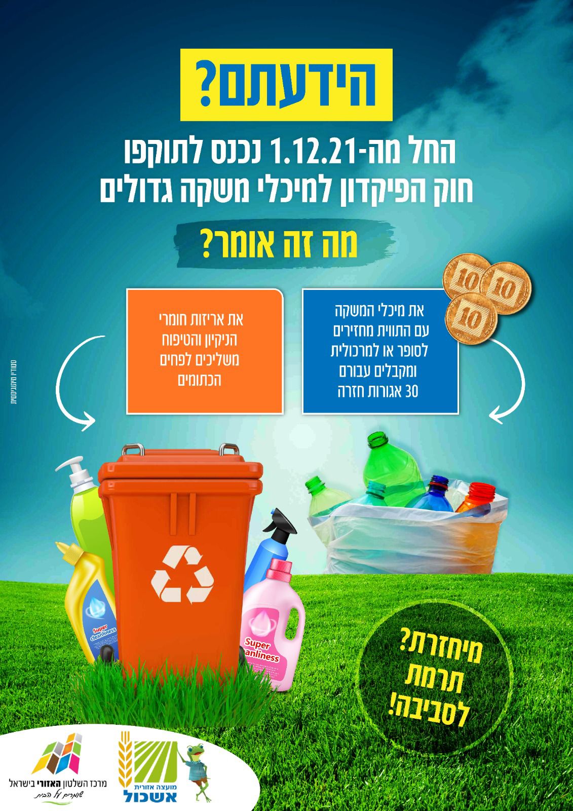 בשבוע הבא תיכנס לתוקפה החלטת המשרד להגנת הסביבה להרחבת חוק הפיקדון וגם בקבוקי משקה גדולים יחויבו בדמי פיקדון. בחודשים הקרובים מחזוריות הבקבוקים יפונו מהישובים ולא יהיה יותר פינוי מרכזי של מכלי משקה גדולים. ניתן יהיה להזדכות על הבקבוקים בבתי העסק או להיערך לאיסוף קהילתי. שימו לב כי עד הוצאת המחזוריות מהישובים תחול תקופת ביניים במהלכה עדיין יהיו בקבוקים ללא תווית "חייב בפיקדון". בתקופה זו בלבד יש להשליך את הבקבוקים שללא התווית ל"מחזוריות" או לפח הכתום. בקישור המצורף תמצאו הסבר מפורט שהכין אגף איכות הסביבה בנושא. השינוי בחוק נועד להגביר את המחזור ולתרום לניקיון השטחים הפתוחים. תקופת המעבר תהיה מאתגרת לכולנו אך אנו נעשה מאמץ לבצע את השינוי באופן חלק.