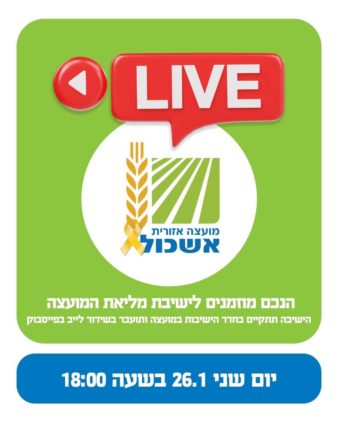 הנכם מוזמנים לישיבת מליאה שתתקיים ביום שני ה- 26/1/2026 בשעה 18:00
