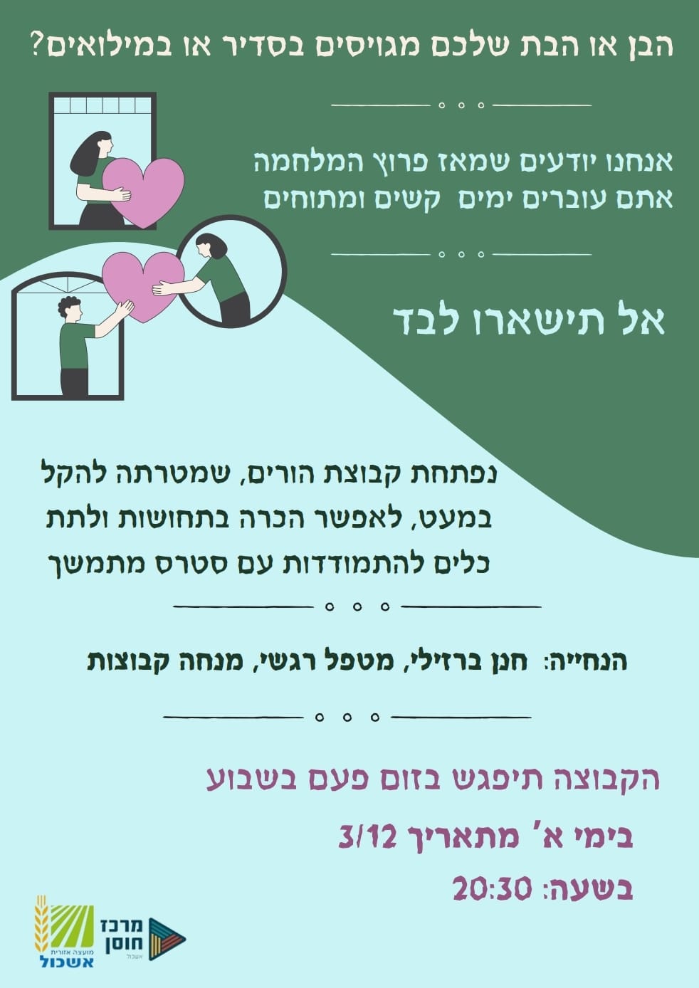 חוסן אשכול פותחים קבוצת הורים בזום שמטרתה להקל במידת האפשר ולהעניק לכם כלים פרקטיים להתמודדות עם לחץ מתמשך. בהנחיית חנן ברזילי, מטפל רגשי.