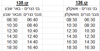 במועצה אזורית אשכול יופעלו הקווים 135 ו-136 בלוח זמנים מיוחד, 6 נסיעות לכיוון בכל קו.