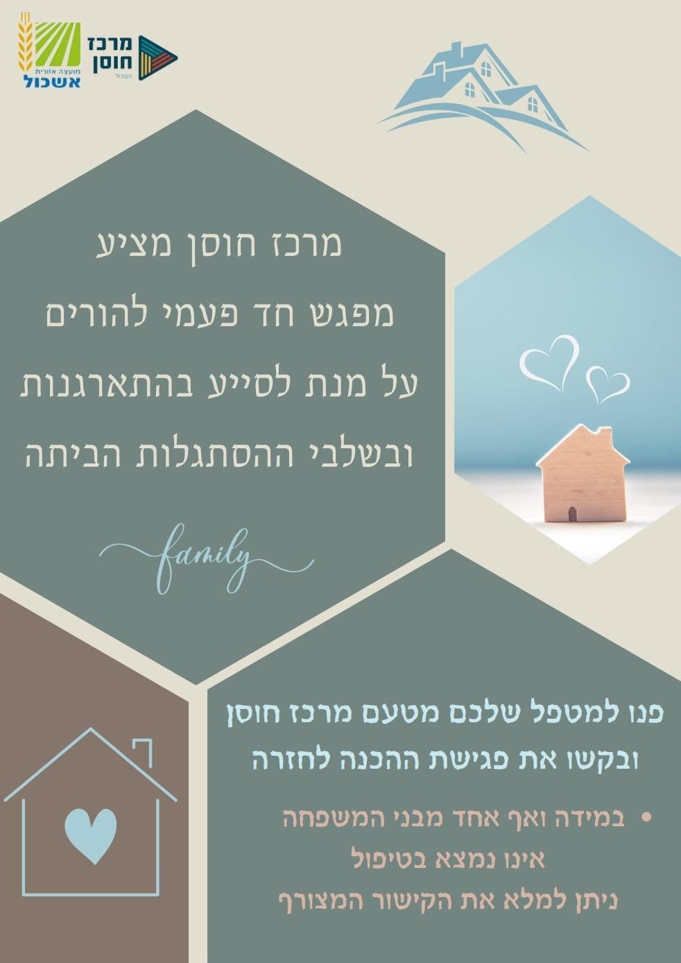 מרכז חוסן אשכול מציע מפגש חד פעמי להורים על מנת לסייע בהתארגנות ובשלבי ההסתגלות הביתה.