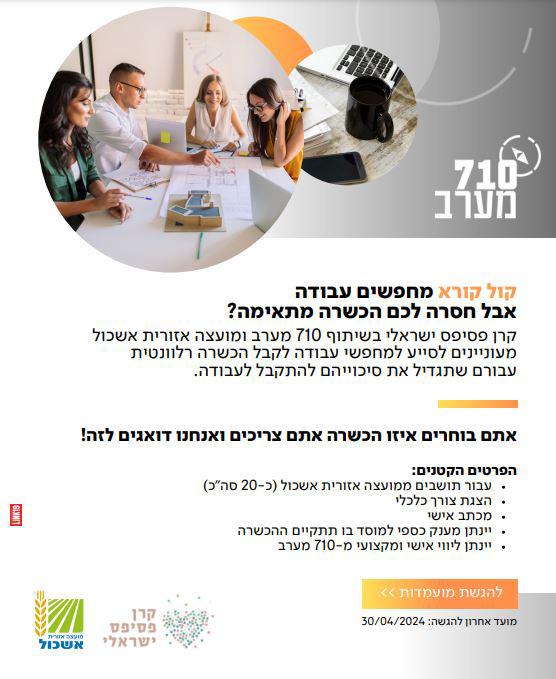 קרן פסיפס ישראלי בשיתוף 710 מערב ומועצה אזורית אשכול יוצאות בקול קורא ומציעות לדאוג להכשרה מקצועית שתגדיל את הסיכוי שלך למצוא עבודה!