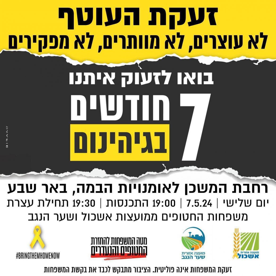 ביום שלישי 7.5 נציין שבעה חודשים שהחטופים והחטופות, חברינו האהובים לקהילה, מוחזקים בשבי, בעצרת משותפת של המועצות אשכול ושל שער הנגב.