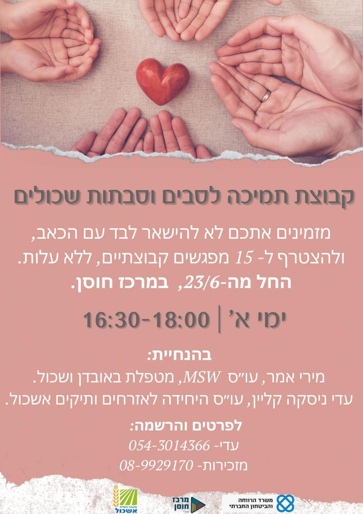 האגף לשירותים חברתיים ומרכז חוסן אשכול מזמינים אתכם, סבים וסבתות תושבי המועצה המתמודדים עם שכול, להצטרף לקבוצת תמיכה של 15 מפגשים. קבוצה שתהווה מרחב בטוח ומאפשר להעזר ולעזור זה לזה בהתמודדות המשותפת, בהנחיה מקצועית.